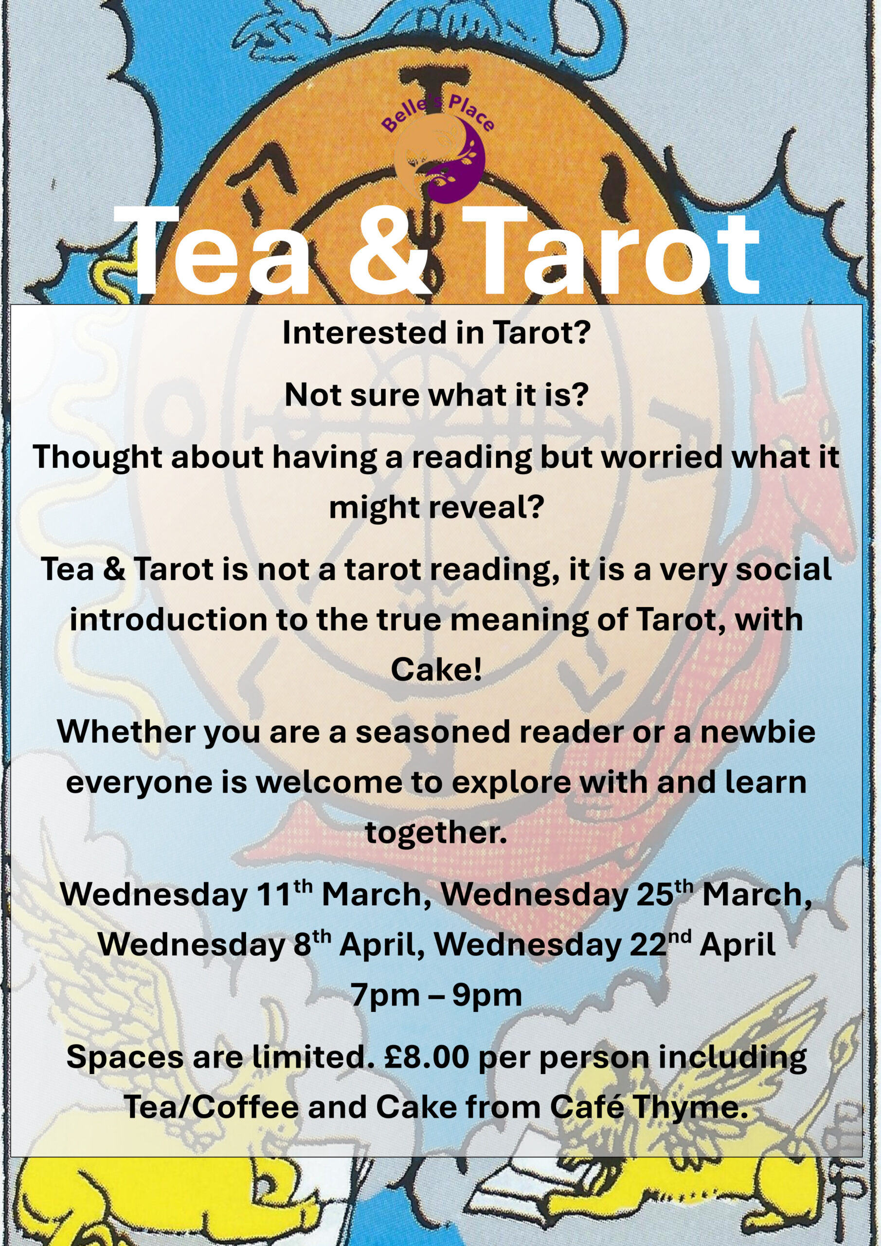 Tea & Tarot is not a tarot reading, it is a very social introduction to the true meaning of Tarot, with Cake!