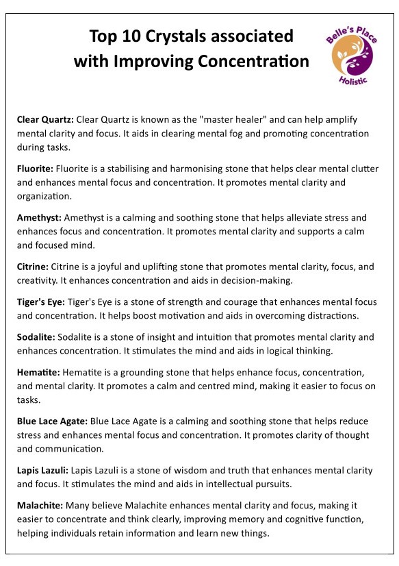 By BellePosted on October 7, 2024Posted in Top 10 Crystal ListsNo Comments on Top 10 Crystals that can help with Concentration Improving concentration and focus can be aided by crystals that promote mental clarity, enhance concentration, and support overall cognitive function. Here are our top 10 crystals commonly used for concentration. Top 10 Crystals that can help with Concentration Post navigation Top 10 Crystals associated with easing Stress & AnxietyTop 10 crystals that may help with Depression Leave a Reply Cancel replyYour email address will not be published. Required fields are marked *Comment * Name * Email * Website Save my name, email, and website in this browser for the next time I comment.