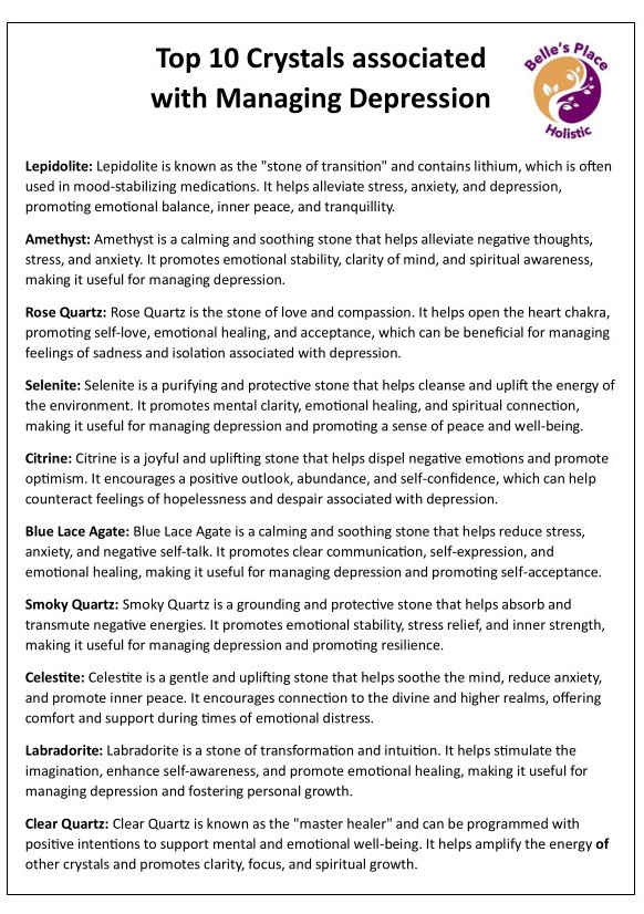 By BellePosted on October 7, 2024Posted in Top 10 Crystal ListsNo Comments on Top 10 crystals that may help with Depression Depression is a complex emotional and mental health condition. Crystals can complement therapy and self-care practices by providing support, comfort, and uplifting energy. Here are our top 10 crystals commonly used to help with depression: Top 10 crystals that may help with Depression Post navigation Top 10 Crystals that can help with ConcentrationTop 10 crystals associated with Enviromental Protection Leave a Reply Cancel replyYour email address will not be published. Required fields are marked *Comment * Name * Email * Website Save my name, email, and website in this browser for the next time I comment.